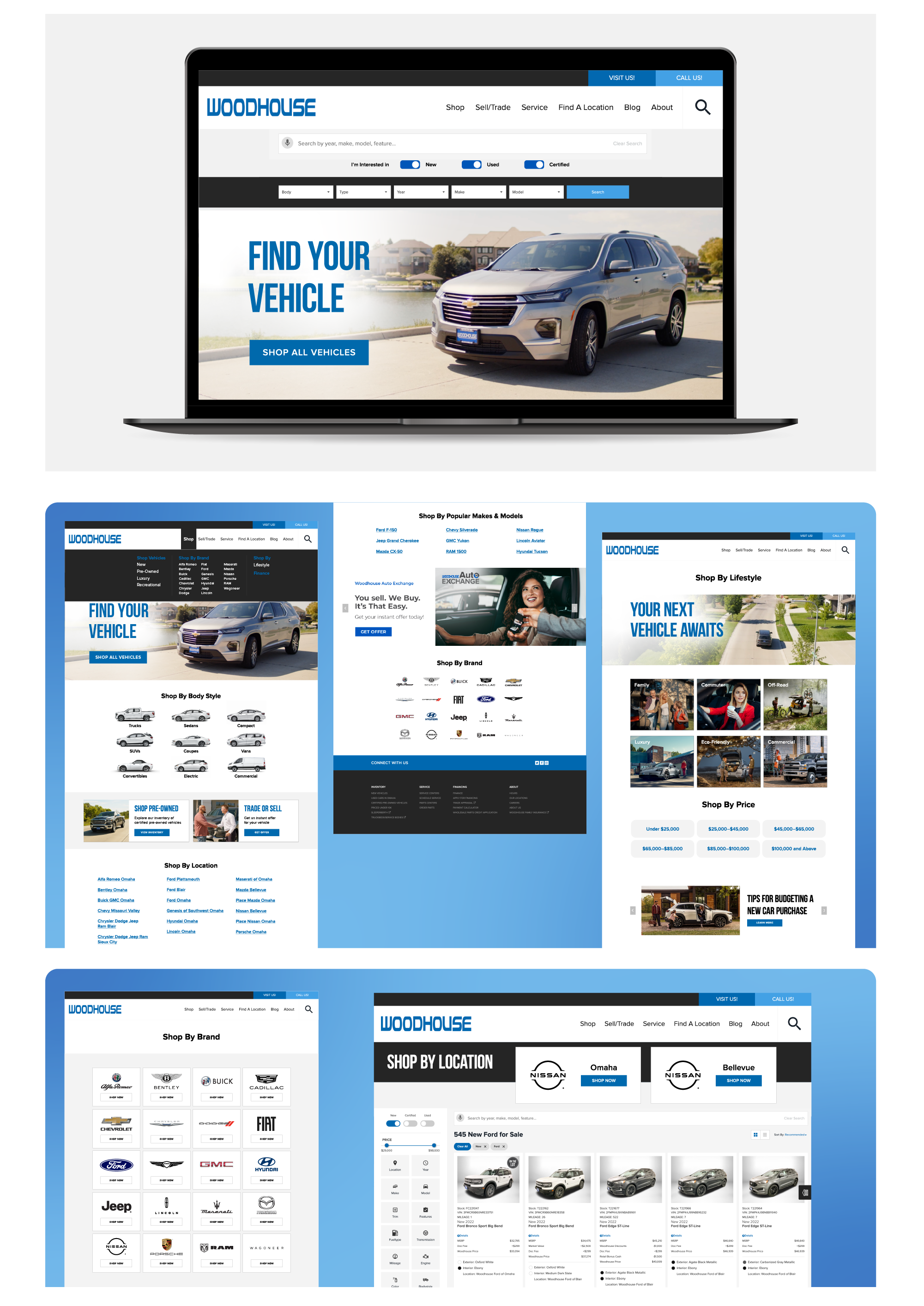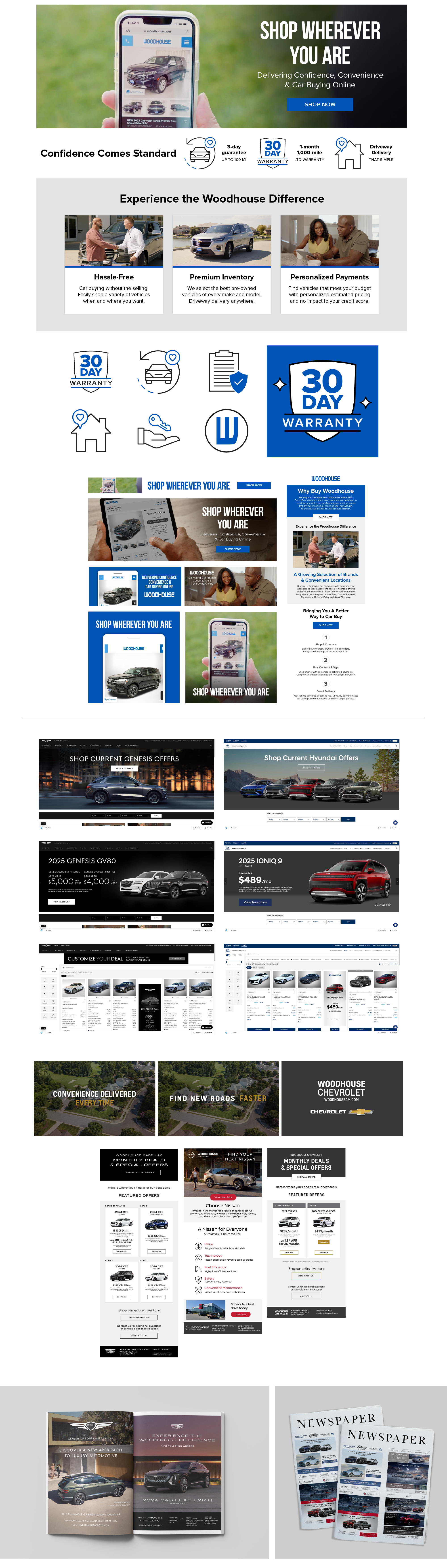 The Woodhouse e-commerce site was developed to give customers the opportunity to buy vehicles online. I worked to make sure brand guidelines were followed and also designed icons and imagery to supplement the overall look and feel. The initial roll-out campaign was “Shop Wherever You Are” highlighting the convenience of online car-buying.